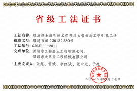 • 《螺旋挤土成孔技术在预应力管桩施工中引孔工法》主要完成人:张超、雷斌