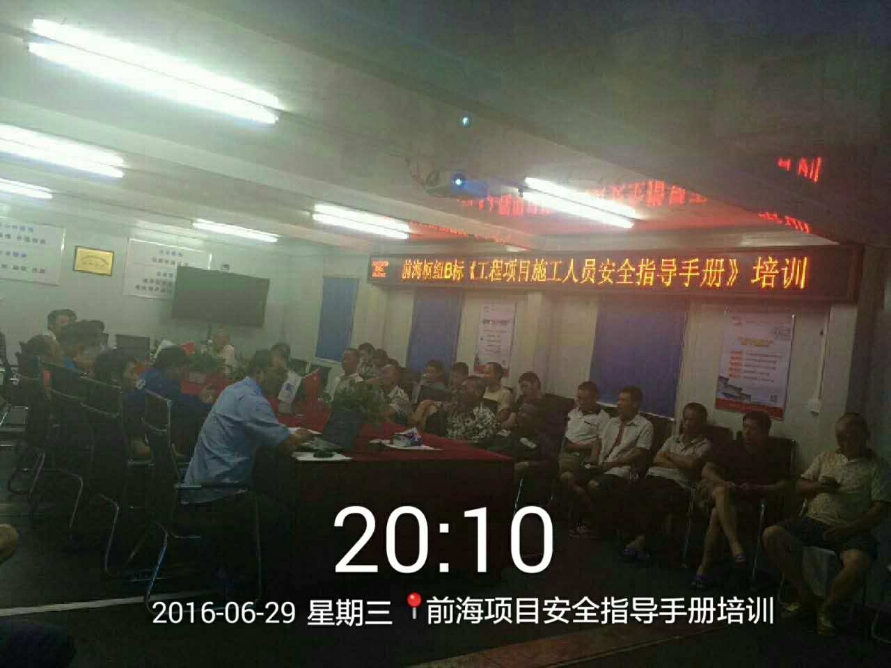根据《通知》文件要求,此次培训为全市统一行动,培训时间为2016年6月29日19:00-21:00。公司各项目部结合项目实际情况,组织开展了《工程项目施工人员安全指导手册》培训工作,通过PPT投影的方式,详细讲解了施工人员享有的权利、应尽的义务和进入施工现场必须遵守的规定;重点讲解了施工现场各工序中主要的安全生产注意事项;强调了施工现场常见的安全警示标志类型和作用。