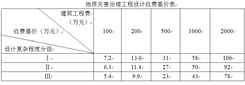 3地质灾害治理工程设计收费基价表(表5),根据《工程勘察设计收费标准》2002年修订本,略有调整。删除了建筑工程费用为10万元、50万元对应的收费基价,增加了建筑工程费用为200万元对应的收费基价。在表下部的备注中,调整了第2条、第3条的取费额。