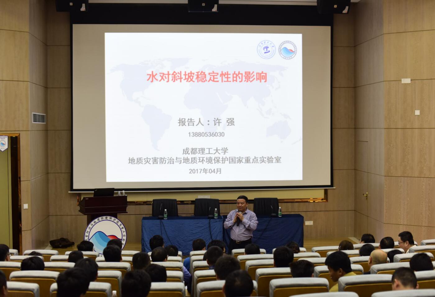 讲座中,许教授从工程地质和岩土力学的角度,结合工程实例、理论分析与实验验证,将地下水的力学作用、物理作用及化学作用对滑坡灾害的影响作了深入浅出的分析。