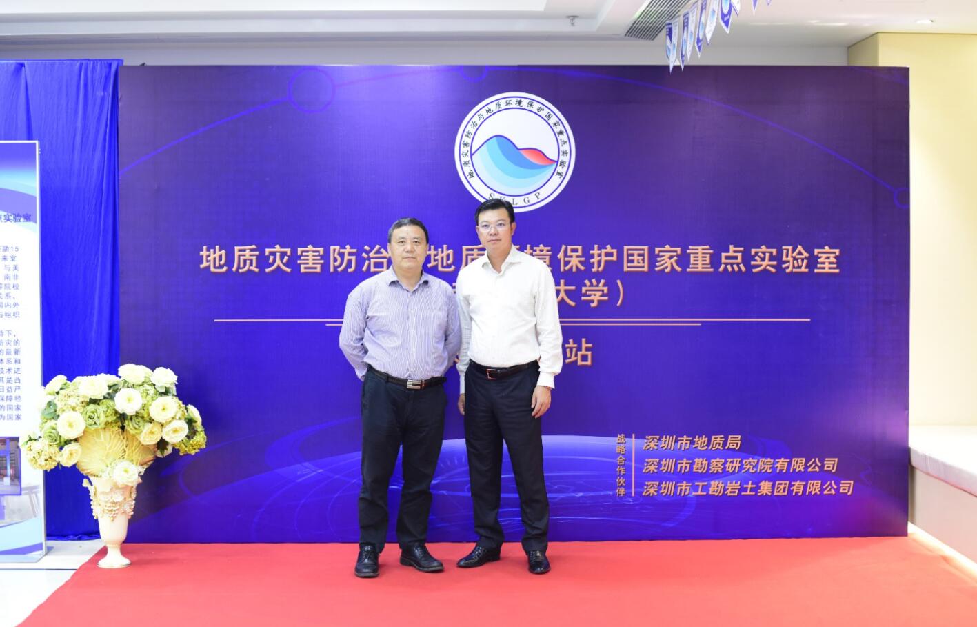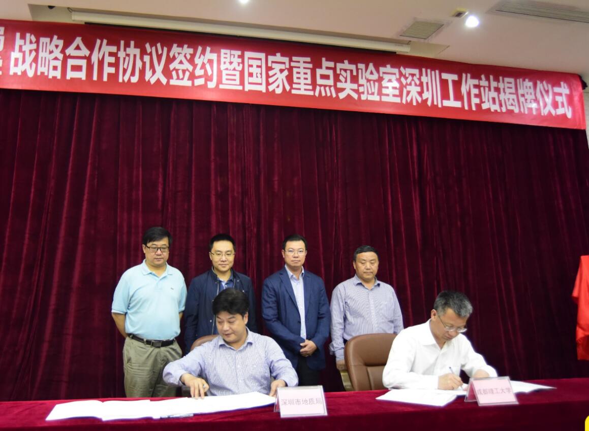 4月25日,地质灾害防治与地质环境保护国家重点实验室(成都理工大学)深圳工作站成立,深圳市地质局、深圳市勘察研究院有限公司、深圳市工勘岩土集团有限公司三家战略合作团队,与成都理工大学签订了战略合作协议书。上午十一点整,地质灾害防治与地质环境保护国家重点实验室(成都理工大学)“深圳工作站”揭牌仪式在深圳市地质局正式启动。成都理工大学校刘树根副校长、地质灾害防治与地质环境保护国家重点实验室常务副主任许强教授、三家战略合作单位相关领导出席了本次揭幕仪式。