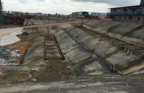 继续前行,我们看到基坑一角采用了大型钢筋混凝土支撑系统,原来是基坑边侧紧临地铁,为保证地铁的安全,采取了加强的支护措施。从目前开挖情况可以判断,基坑一侧的变形较小,地铁一侧也处于稳定状态。