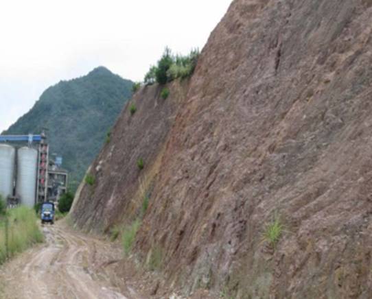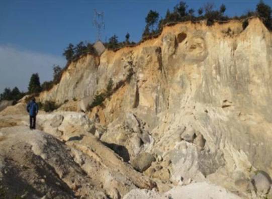 坡上无植被生长,在暴雨期间地表水流冲刷条件下,容易失稳发生滑塌、坍塌及小型坡面泥石流等灾害。