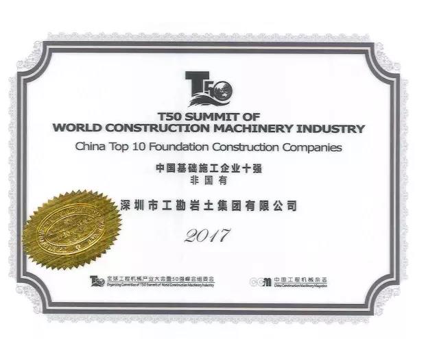 2017年9月18-19日,第四届全球工程机械产业大会暨50强峰会在北京召开。峰会上,深圳市工勘集团荣登“中国基础施工企业双十强”榜单,成为中国基础施工界领军企业。
