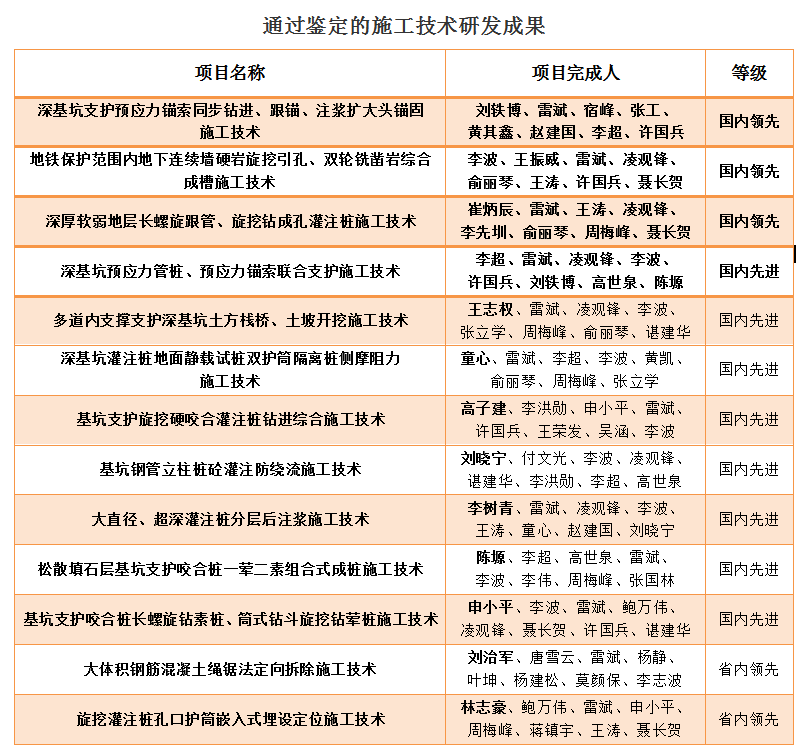 近年来,集团的施工技术研发成果保持稳步上升,在完成申报科技成果鉴定、提交专利、评选省市级工法等成果总结工作的同时,也将这些新型技术大力投入应用到实际生产中,取得了显著的社会效益和经济效益。深圳工勘集团作为国家高新技术企业和岩土行业的领航者,将继续充分发挥企业领头人的创新精神,在“师徒制”的引导下,不断壮大公司现有科研团队,加大在岩土施工技术的科研投入力度,努力把科技成果转化成现实生产力,为岩土行业的发展贡献出一份力。