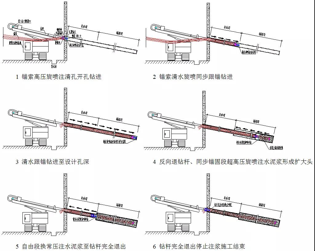 该成果通过对钻进机具及工艺的改进、喷射浆液和压力的差异调整,将常规锚索施工过程中的钻孔、安放锚索、注浆等工序“三合一”同步完成,并形成扩大头锚固,实现无工序搭接及闲置等待,将原常规锚索施工时间缩短三分之一以上,施工效率高,达到加快施工进度的效果,且锚固效果也得到显著提高,具有增强锚固力的作用,在相同地质条件、相同施工区段长度时,相对于常规锚索可减少设计用量,从而达到降低成本的目的。