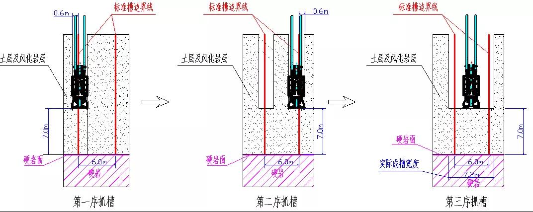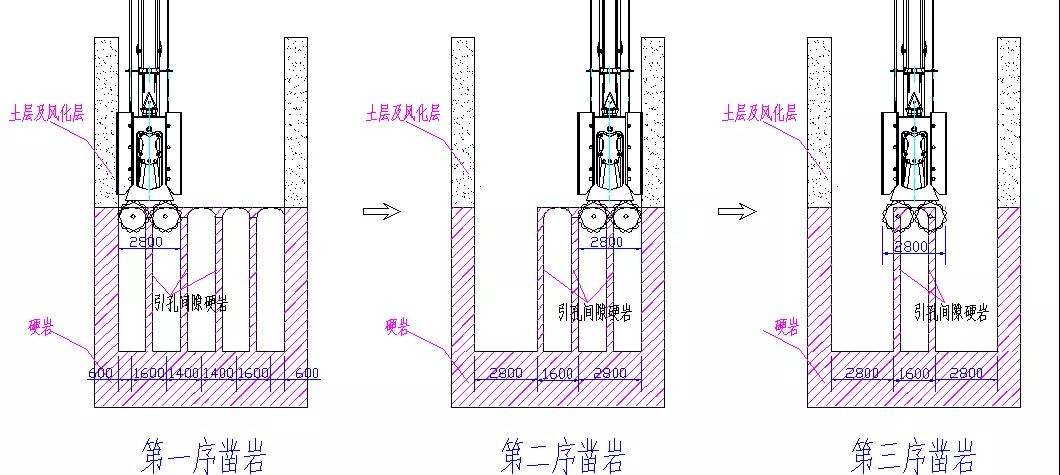该成果针对地铁保护范围内地下连续墙硬岩成槽施工技术进行了研究,整体为旋挖钻机硬岩引孔配合液压抓斗和双轮铣进行成槽,先采用液压抓斗机进行槽段上部取土,再利用旋挖钻机对槽段硬岩部分进行主、副孔分序引孔,然后采用双轮铣对已引孔硬岩部分分三序凿岩并利用铣槽机反循环清渣,最后采用液压抓斗进行刷壁、清孔并灌注混凝土成槽。本项施工技术相较常规的“冲击入岩+方锤修槽法”和“双轮铣直接成槽法”进尺效率提升3~5倍,实现快速入岩成槽,且有效减少了对周边环境的干扰,保证了地铁运营安全,旋挖预引孔的施工措施也使得双轮铣设备耗损大大降低,达到降低综合施工成本的目的。