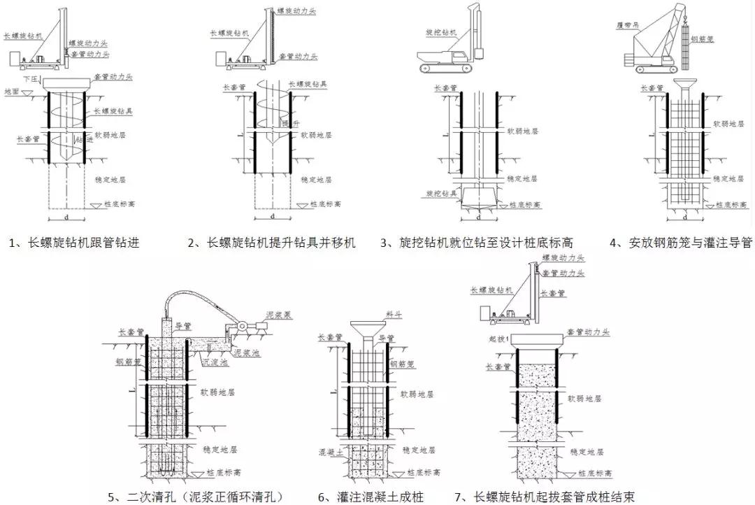该成果针对深厚软弱地层灌注桩施工技术进行了研究,适用于水下混凝土灌注桩领域,可施工支护桩、工程桩、咬合桩等。本技术通过采用长螺旋跟管钻进完成深厚软弱地层的护筒埋设和成孔,达到在不良地层中的护壁作用,保证了钻孔的稳定,再使用旋挖钻机在护筒中钻进至设计孔深,充分发挥了旋挖钻机钻进效率高、垂直度控制好的特性,提高施工工效和钻孔质量,并在桩身混凝土浇筑完成后由长螺旋钻机一次性起拔护筒完成施工,可有效解决软弱地层中的塌孔、缩径等问题,达到加快施工进度、保证成桩质量、降低综合成本的效果,形成了相应的施工技术。
