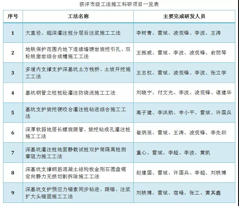 2019年9月20日,根据深圳市住房和建设局《关于开展深圳市建设工程市级工法评选工作的通知》(深建科[2009]11号)、深圳建筑业协会《深圳市建筑业施工工法评审办法》(深建协字(2017)第053号)要求,深圳建筑业协会公布了获评2019年度第一批深圳市建设工程市级工法的项目。本次市级工法评选活动共受理深圳市施工企业申报的141项企业工法,经专家组评审、深圳建筑业协会总工程师委员会审定,其中93项企业工法被评为2019年度深圳市建筑业施工工法(第一批),深圳工勘集团9项工法榜上有名。