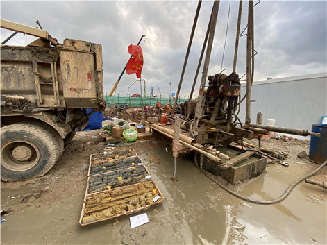 3月6日,临时栈桥正式通车,勘察团队与众多施工队伍一同入场,并在当天晚上就提供了现场施工紧急需要的地质柱状图及剖面图。由于现场参建单位众多,作业面有限,工人们只能开展交叉作业,在泥土松软的场地上不断搬动钻机,调整作业地点。
